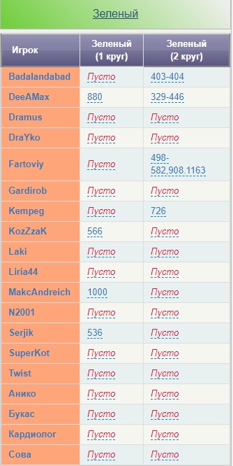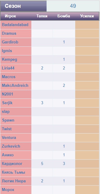 Также есть таблица за пропущенные тапки, бомбы за весь сезон (2 недели)
